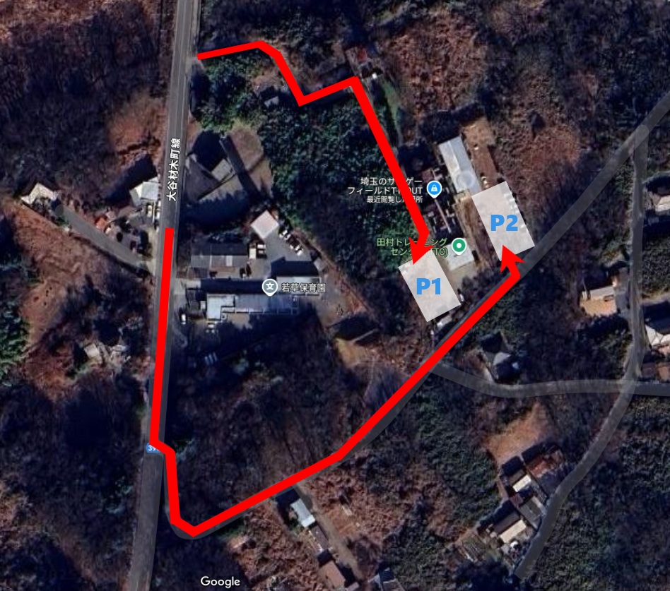 上記、上岡バス停下車後、県道391号大谷材木町線に進み、田村装備開発本社を通り過ぎて左手、TTC(Tamura Training Center)まで徒歩約8分